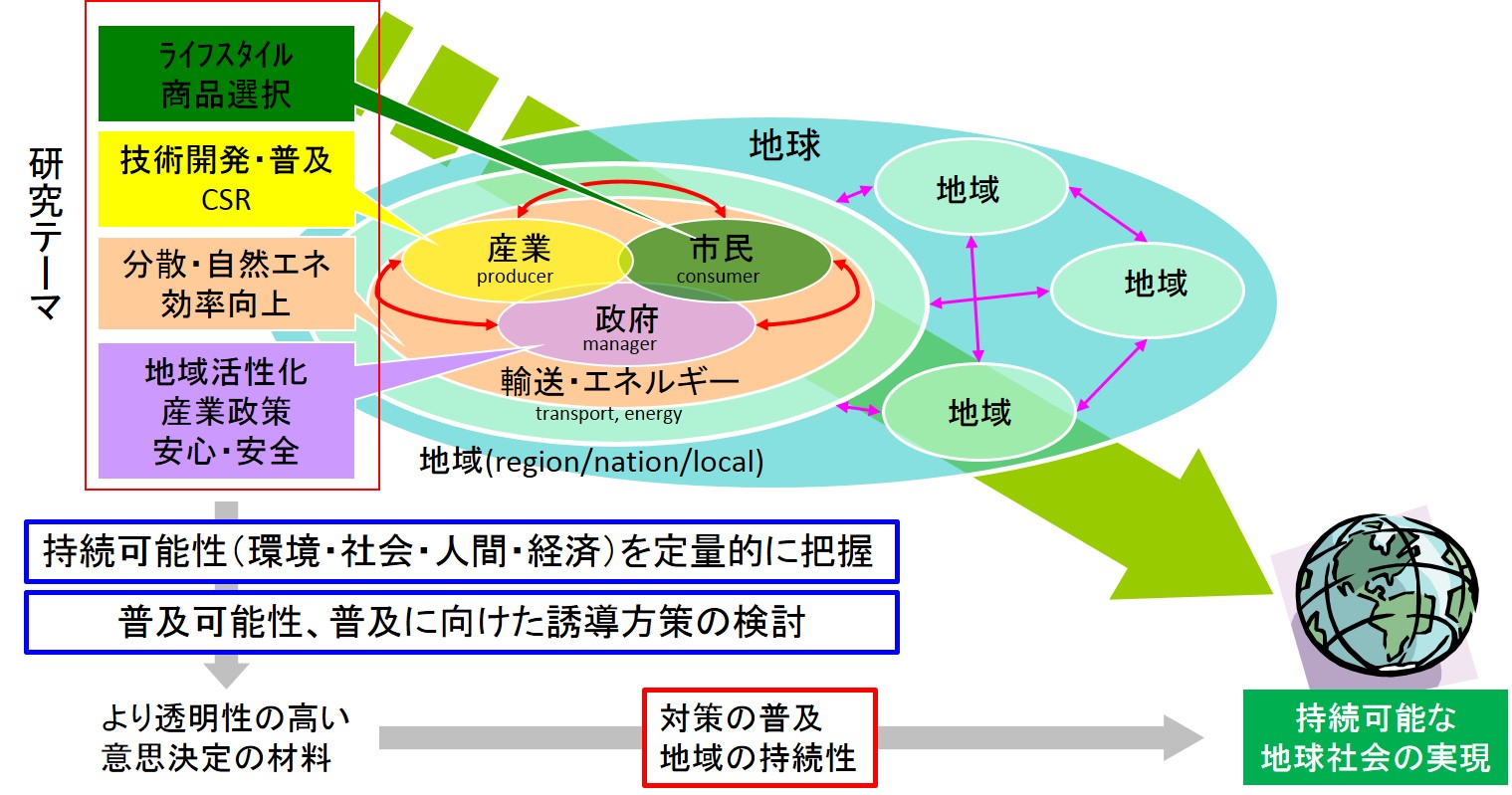 優れた技術やシステムは、地域の持続可能な発展や人々の幸福につながります。しかし、技術やシステムは、人々や社会に受け入れられて初めて意味を持ちます。そのため、本研究室では、工学と社会科学を融合させた視点から、再生可能エネルギーやリサイクルシステム、低炭素型の都市計画などを「持続可能性」という軸で定量性に評価したり、環境と調和した技術・システムを普及させるための手法を考えています。